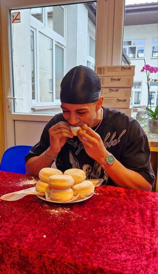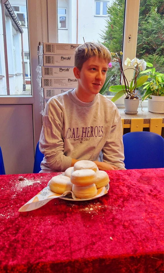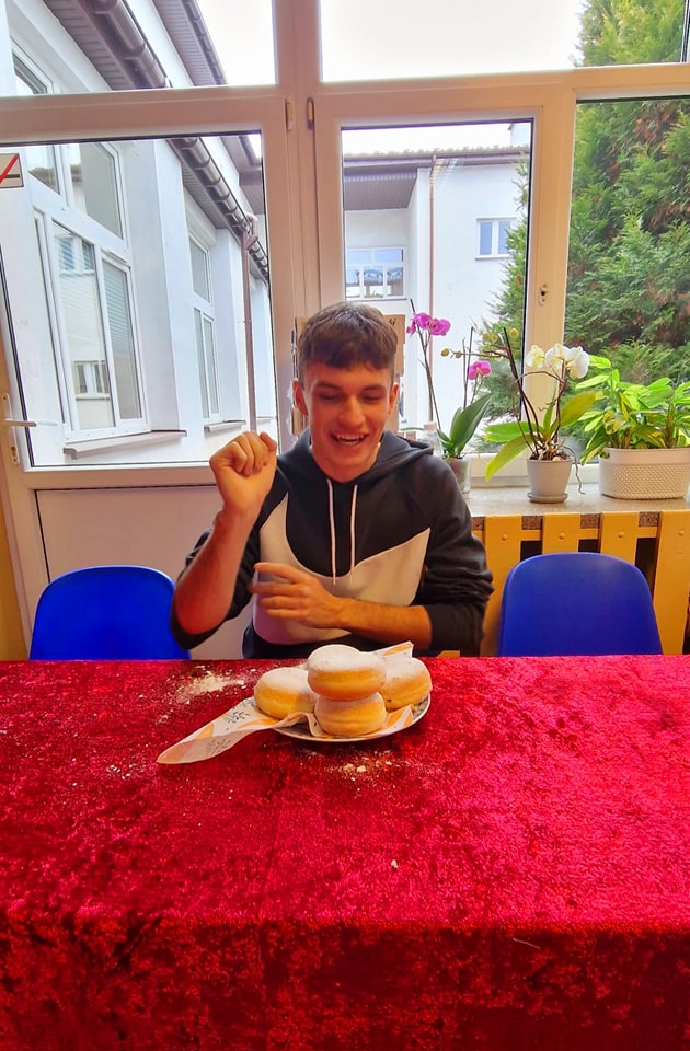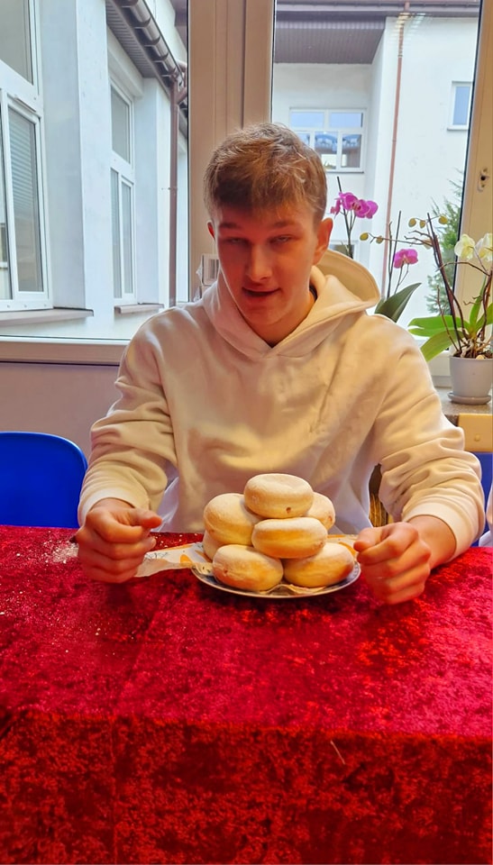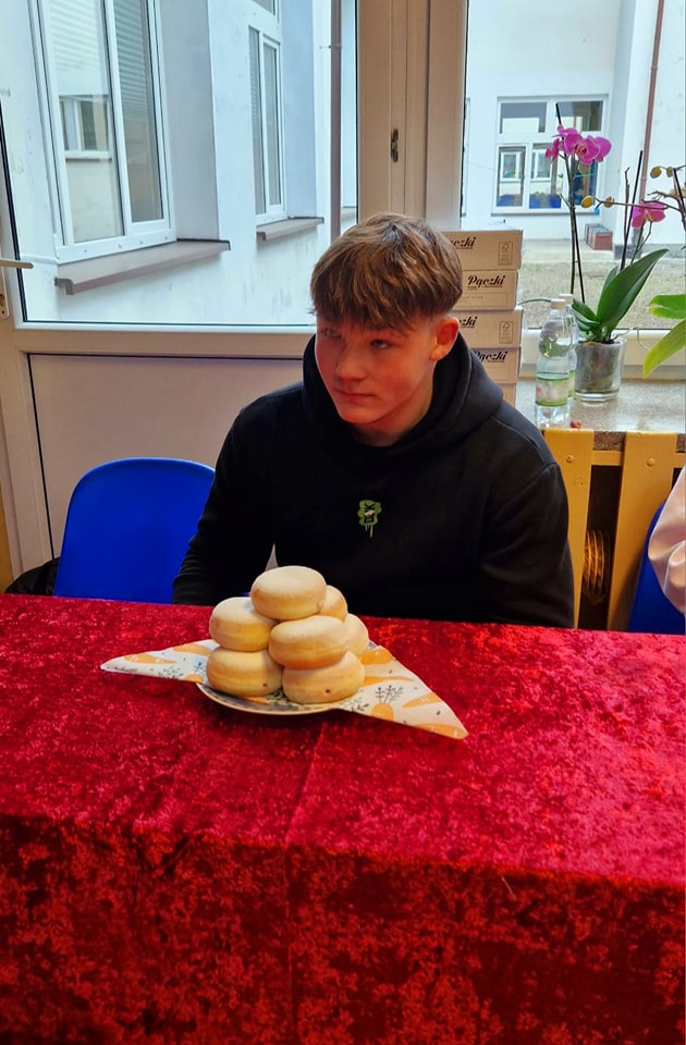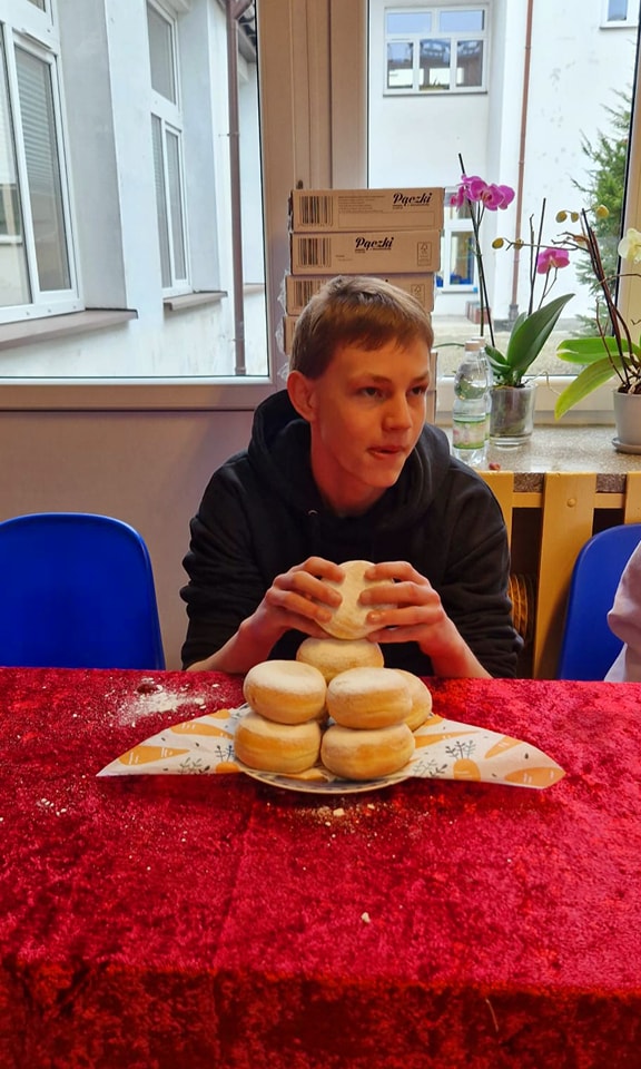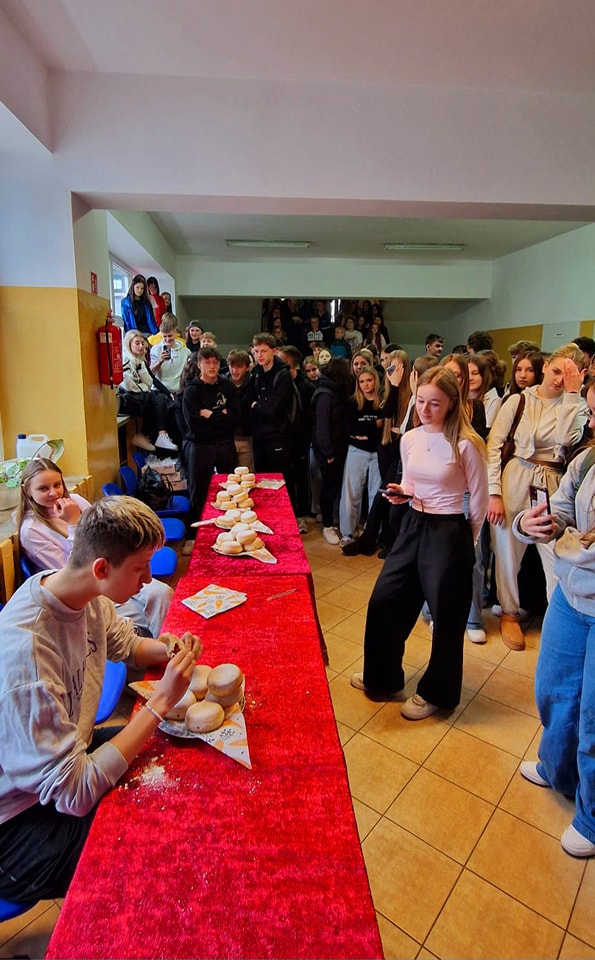 Społeczność naszej szkoły podziwiała zmagania zawodów w jedzeniu pączków, które wygrał Miłosz Janczy z klasy 2b.